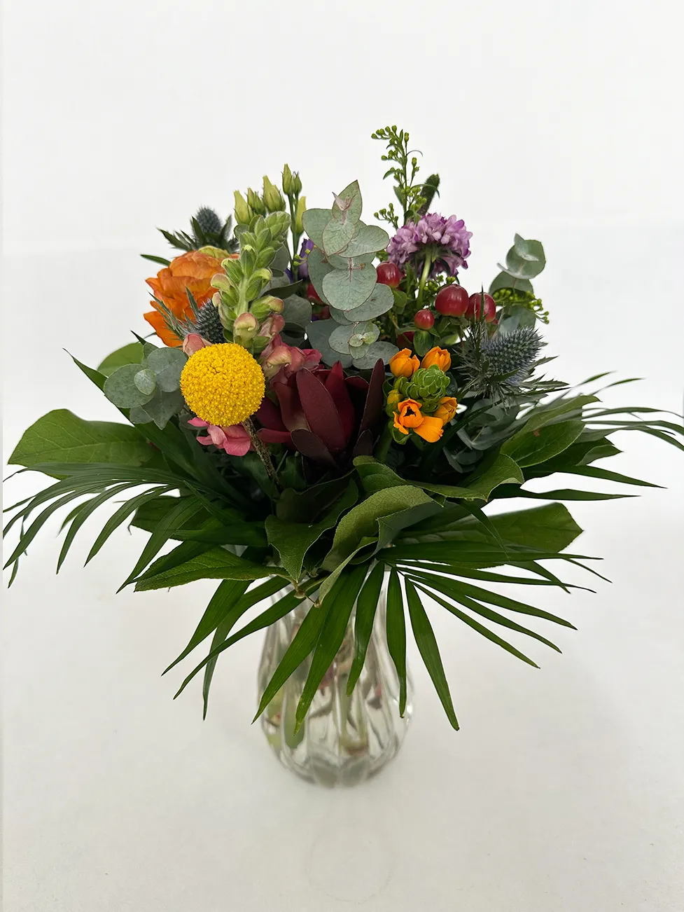 En smuk buket hvor blomster og farvevalg sammensættes af blomsterdekoratøren.
